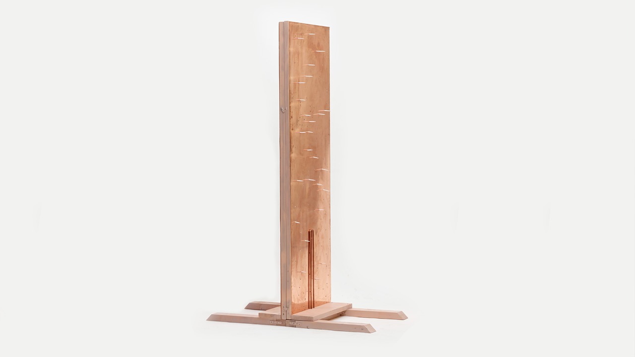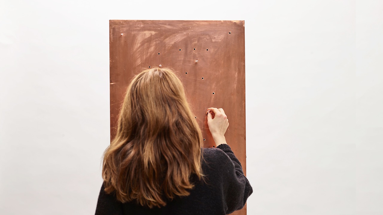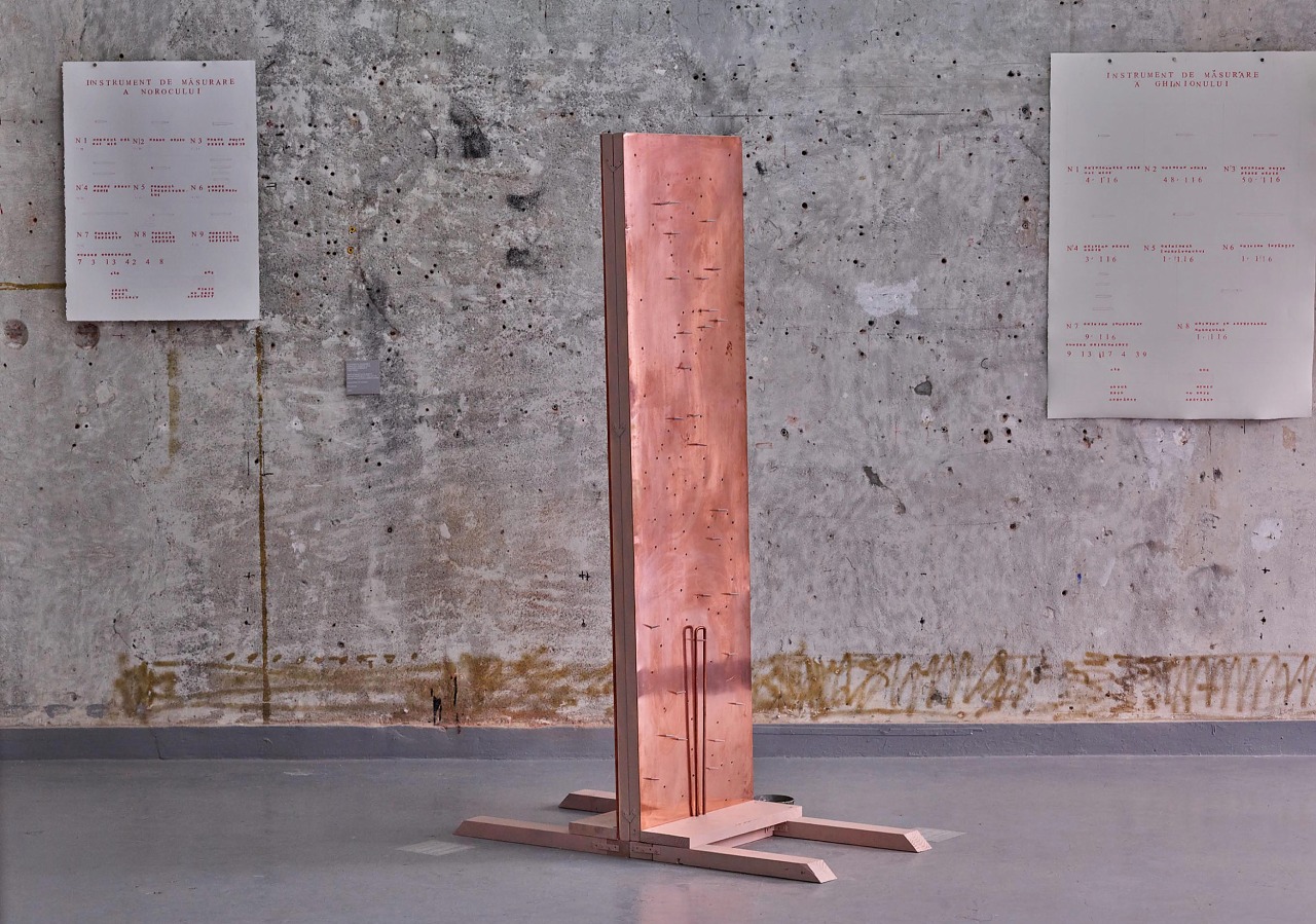 "The Battle for Luck exhibited in both Germany (Düsseldorf) and Romania (Bucharest), became the venue for a social experiment. The focal point was the Luck measuring concept, consisting of two wooden boards displayed side by side (Düsseldorf) and two wooden and copper boards displayed back to back (Bucharest), with one side measuring good luck and the other bad luck. Both boards are drilled, with only one hole going through both. Ceramic needles of varying lengths, colors, and terminations were inserted into almost all the holes. The public was invited to draw needles and measure their Luck using two separate drawings that depicted the exact characteristics, sizes, and meanings of each category of needle.